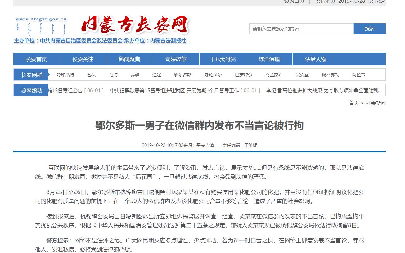 内蒙古长安网发布的文章。网页截图 10月22日,内蒙古自治区政法委主办的内蒙古长安网发布《鄂尔多斯一男子在微信群内发布不当言论被行拘》一文。文章称,8月25日至26日,鄂尔多斯市杭锦旗吉日嘎朗镇的村民梁某某,在没有购买使用某化肥公司的化肥并且没有任何证据证明该化肥公司的化肥有质量问题的前提下,在一个50人的微信群内发表该化肥公司含量不够等言论,造成了严重的社会影响。 文章指出,接到报案后,杭锦旗公安局吉日嘎朗图派出所组织民警展开调查。经查,梁某某在微信群内发表的不当言论,已构成虚构事实扰乱公共秩序,根据《中华人民共和国治安管理处罚法》第二十五条之规定,嫌疑人梁某某被杭锦旗公安局依法行政拘留8日。 今日,杭锦旗委宣传部工作人员向新京报记者表示,当地对梁某某所指的化肥进行检测,结果显示各项指标均合格。而梁某某在微信群里鼓动当地村民去镇里面上访、聚集,之后当地20多个村民开了私家车到镇政府,将政府和企业大门堵住,并拉横幅。 上述工作人员表示,梁某某的行为已构成扰乱社会公共秩序,公安机关据此将其拘留。目前,梁某某已被释放。 编辑 潘佳锟 校对 吴兴发