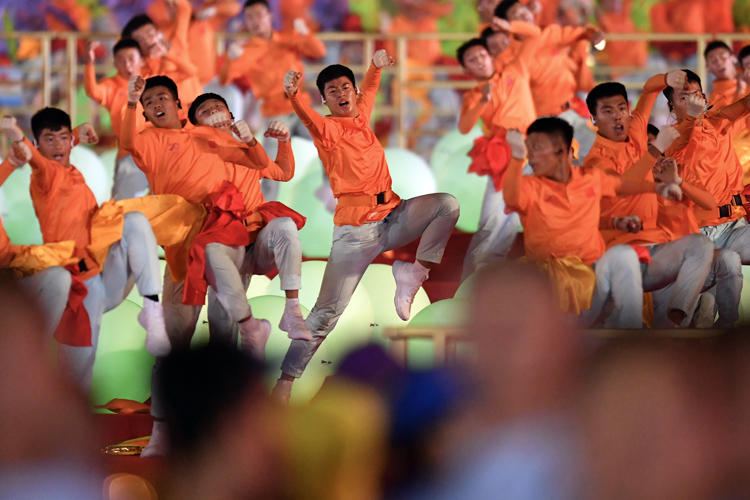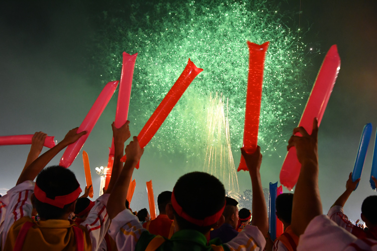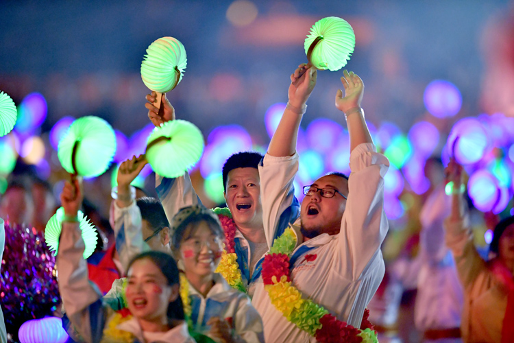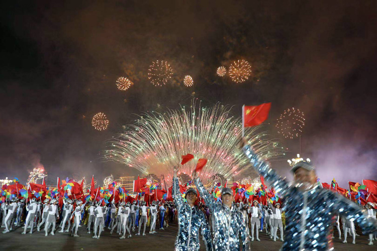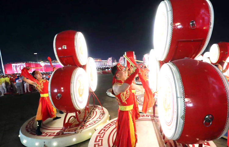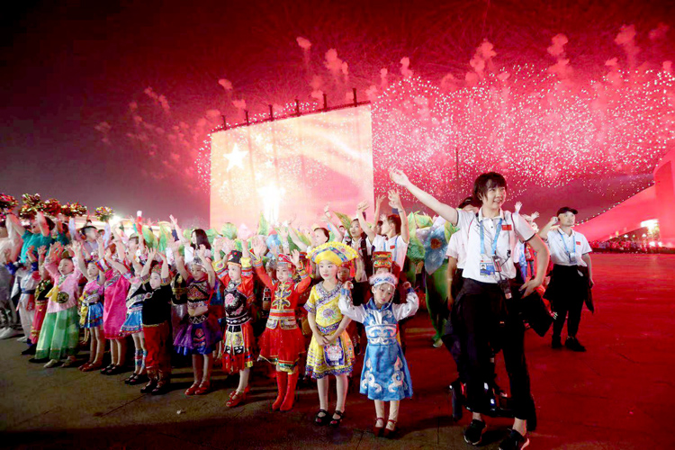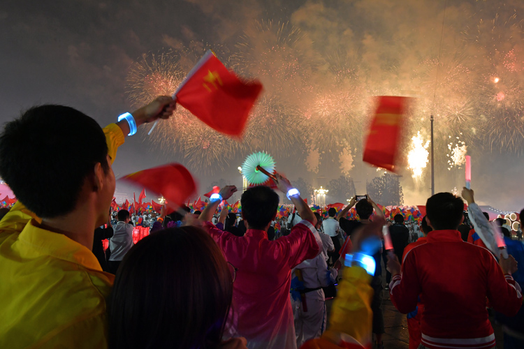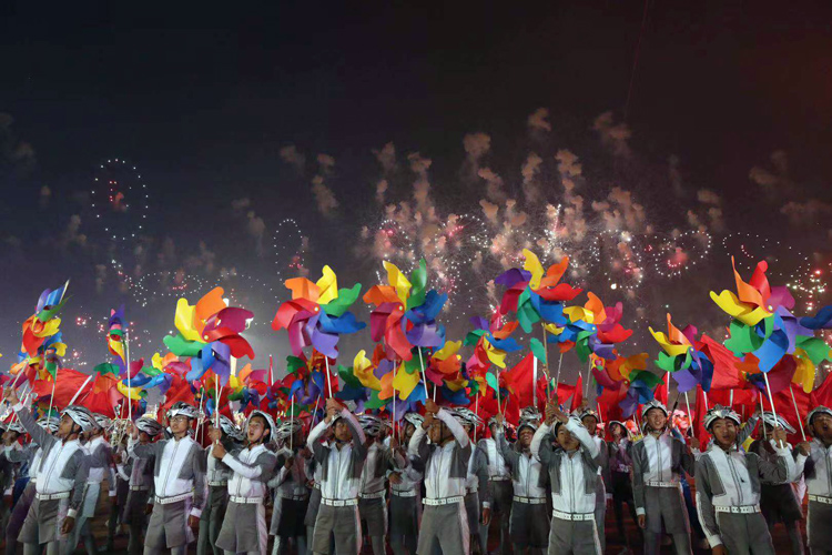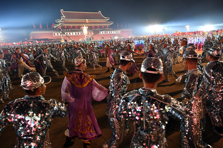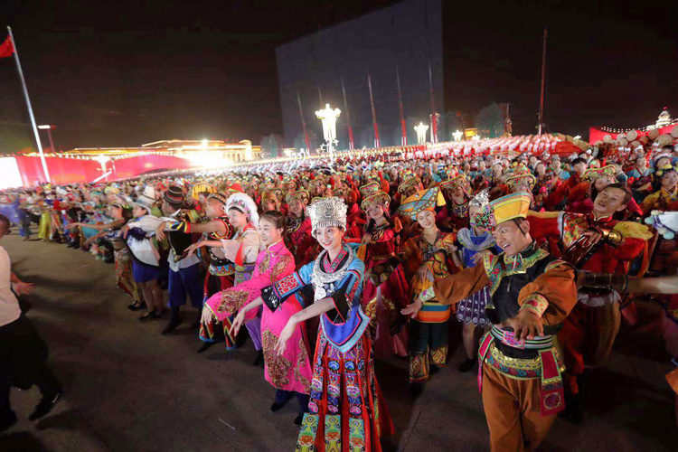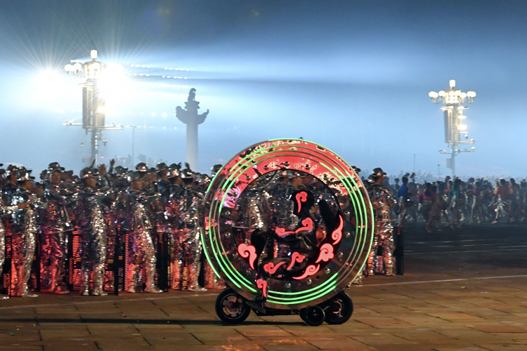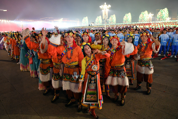 新京报讯 10月1日晚,庆祝中华人民共和国成立70周年联欢活动在北京天安门广场举行。整个联欢活动分主题表演、中心联欢表演、群众联欢、烟花表演四个功能表演区。
