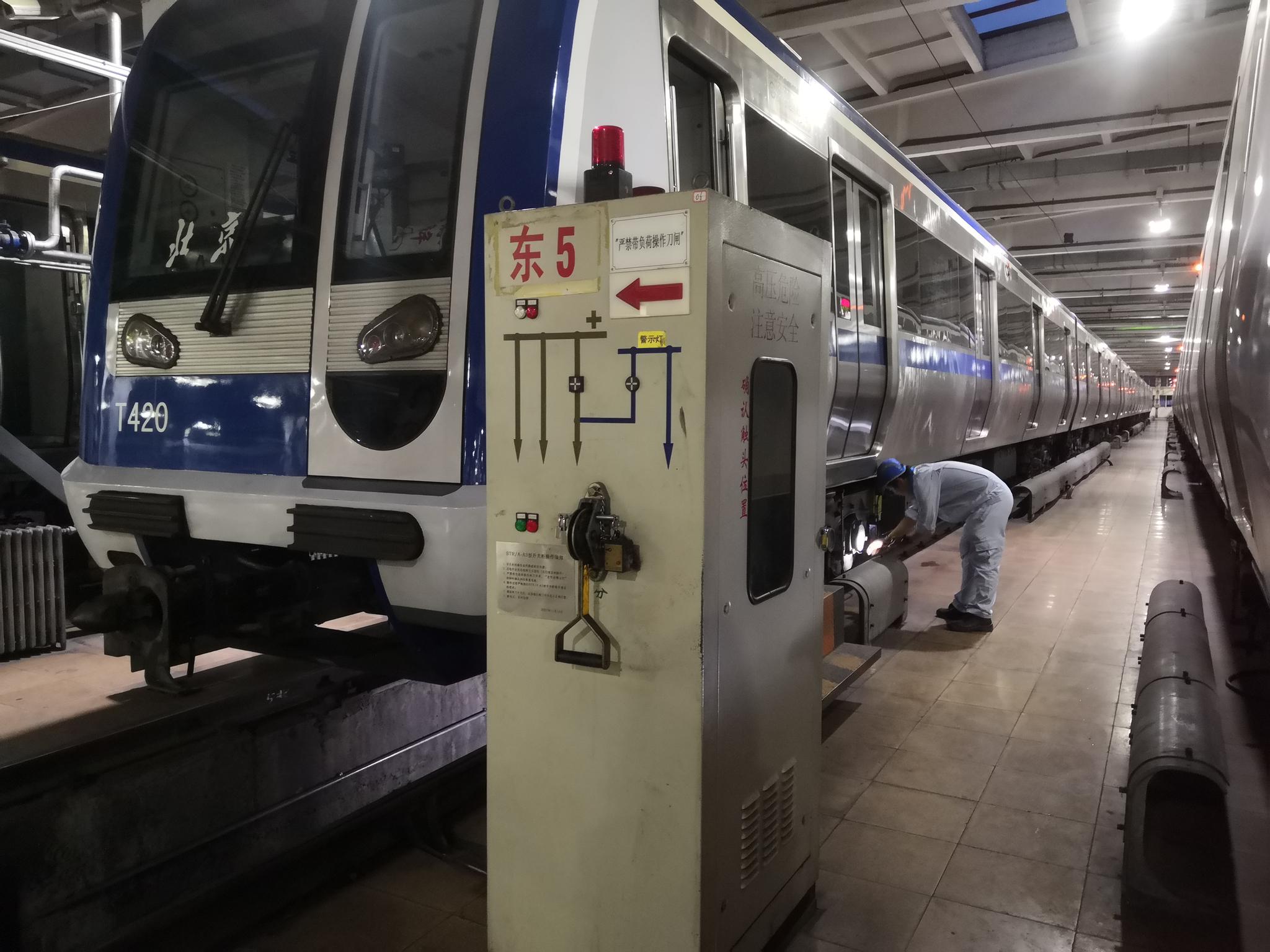 从上世纪80年代开通运营以来,地铁2号线沿着古城墙的痕迹,跑了三四十年。比起蔓延到城市四五环的地铁线路,见证了现代化的车轮一点点从郊区荒凉的土地碾过,2号线守着最古老的北京城,日新月异的感觉降低许多。不过,它还是记录了维修中心门口的臭水沟变成了绿化带,崇文门的菜市场上长出了新世界百货,破破烂烂的东直门变得越来越齐整,现代化的商场、企业丛生。 如今,这张蔓延在北京地下的庞大而细密的地铁网,比普通人的想象更复杂,有井然有序的运行,也有牵一发而动全身的严密。延长运行时间后,除了列检员开始“连轴转”,其他岗位也紧跟着调整。供电分公司开始制定新的巡视、维修计划,通号分公司正在做设备故障演练,线路分公司把7到8千米的巡检区段调整到3.5到4千米,科技发展公司要确保延长运营期间自动售检票等设备运行正常…… 2号线的工作人员常说,这条线任务多,遇到特殊节日和活动庆典,增加发车数量、延长运行时间都很常见。这位47岁的老员工可以一点儿不卡壳地列举:过了元旦是春运,春运之后有两会,清明假期和五一假期时隔不长,紧接着暑月、防汛、十月一,马不停蹄。不过,几十年来,临时的变化虽多,像这次的每周五六都延长运行的长效改变,还是第一次。  太平湖维修中心,地铁2号线的列检库。新京报记者王双兴 摄