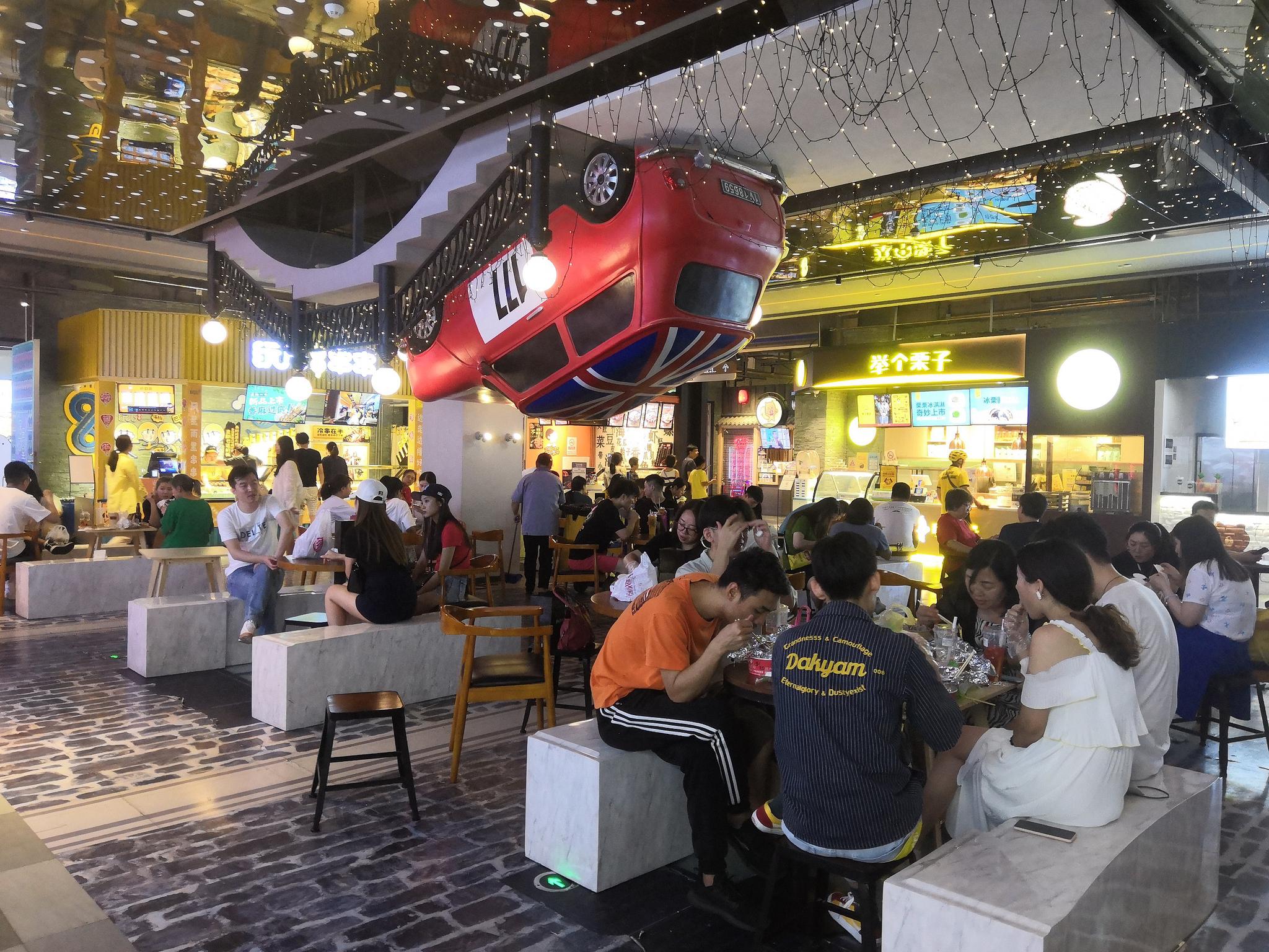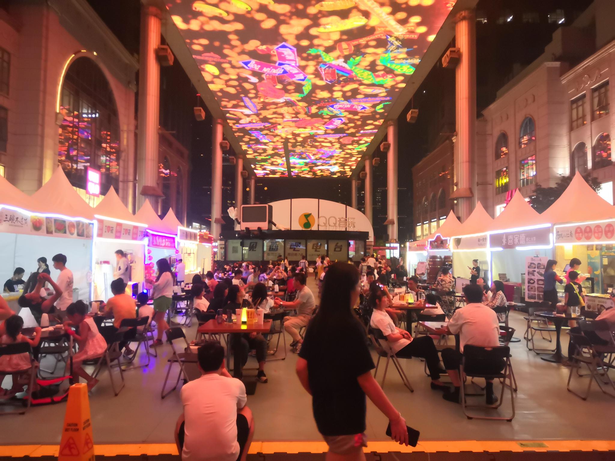 “深夜食堂” 夏秋之交的北京,夜幕在七八点钟开始落。位于北京中轴线上的前门大街迎来了它一年中最热闹的时间段,和其他商区相比,这里的茶器、汉服、文房和字画更密集,别无二致的是,四处挤满了前来旅行的游客。放暑假的孩子们让街区的音量提高了好几度,有的被父母拉到全聚德门口合影,有的逐个摸路旁的喷泉,有的在旗袍店里唱《夜上海》。 大栅栏西街的保安,下班时间从晚上10点钟延长到了11点,“维持秩序”的工作大多数时候无所事事,他靠在路边,看外卖员抢单。 40多岁的外卖员入行一年了,白天,送出一单外卖可以给他带来四五元的收入,晚上则涨到五六元,如果熬到零点后,一单还能再多赚两三块钱。 夜里10点,徐佳(化名)和男朋友穿过南锣鼓巷,钻进了震颤酒吧。这是她来北京实习的第一个周末,体验酒吧,列在北漂愿望清单的首位。 就着一杯马提尼,听完了好几首《还珠格格》经典曲目。酒精和旋律“回忆杀”,促着年轻情侣聊起各自的童年经历,这样的瞬间对暂时结束异地恋的恋人而言显得珍贵,徐佳觉得有点“上头”。 十一点钟左右,酒吧开始迎来最热闹的时刻,五道营的胡同也在这时开始苏醒。酒吧之外,服装店、饰品店、餐馆也在暮色降临后陆续开门,标着“特价”的小东西被搬到最显眼的位置,注视着边走边自拍的女孩子和吵着吃冰激凌的小朋友。 以前,人们说,到了晚上,北京只有簋街、工体、三里屯值得一提。如今,越来越多的“深夜食堂”给北京的夜晚提供了更多的去处。 合生汇商场的灯光已经开始渐次熄灭了,一部分年轻人钻进了回家的出租或地铁,“夜猫子”们则转移到了地下一二层的21街区。  夜里11点,合生汇的深夜食堂聚集很多年轻人。新京报记者王双兴 摄