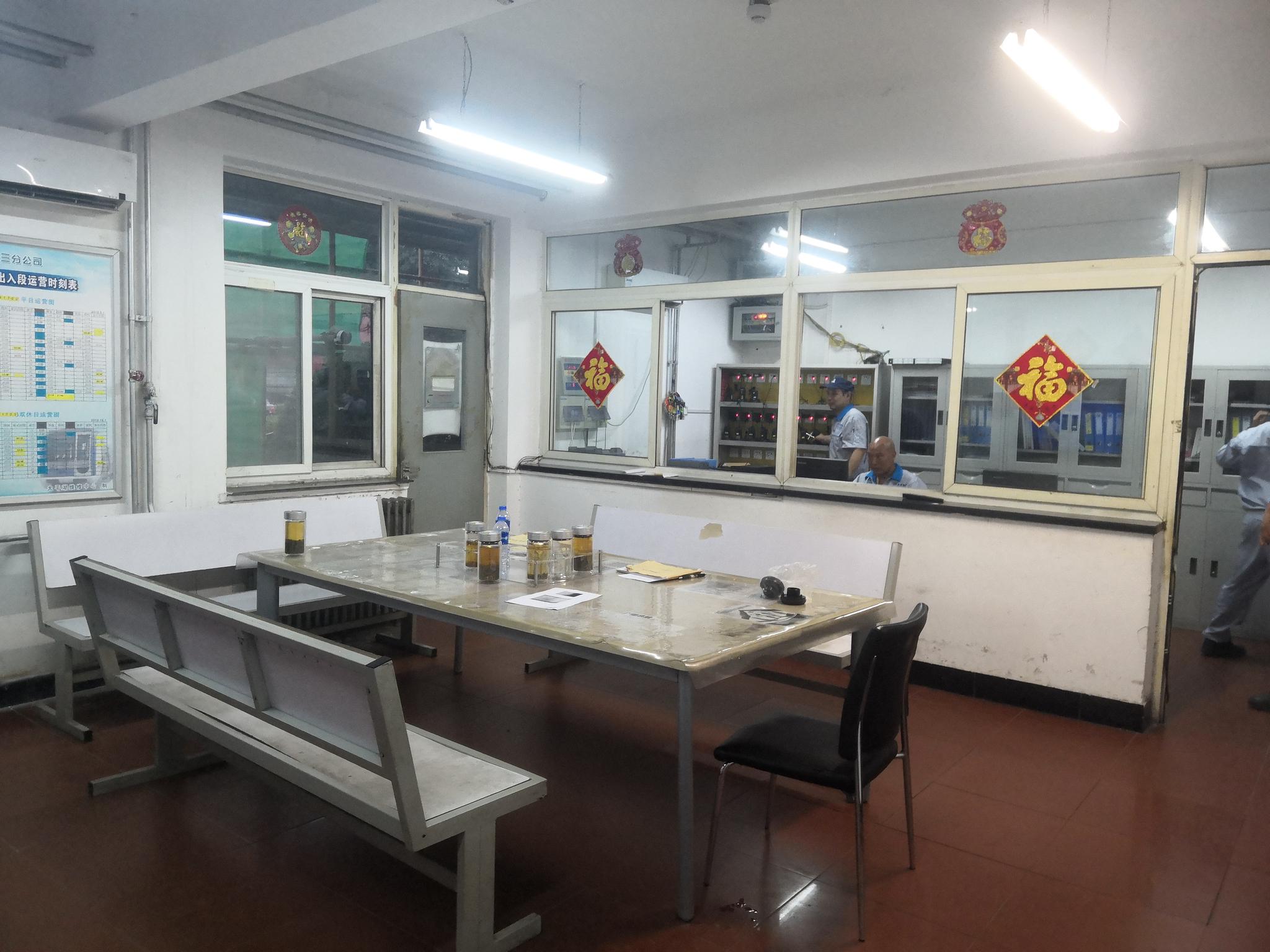每逢周五周六,10列地铁将在凌晨1点30分左右陆陆续续回库,750伏的高压电切断后,两名工作人员到列检库门口接车。 每列地铁120米长,由6节车厢、10万多个零部件组成。列车广播、空调是否运行良好,车辆部件是否松动、磨损,需要一位检修人员绕行车辆一周,另一位进入车厢底部,从前至后检查。 全部的检修工作完成,大概需要一个半小时,凌晨3点多,距离清晨首班车的启动不足2小时了,忙完接车检修的8位员工,紧接着要开始着手送车准备了。 以往,末班车不到夜里12点钟便全部回库了。完成检修工作,1点半左右,距离3点多准备送车,还有一个多小时的休息时间。检修人员可以“喝点水,抽根烟,趴在桌子上休息一下”。维修中心的值班室正中,放了一张长方形大桌子,每边趴俩人,8个人正好。但如今,赶上周五周六的地铁延长运行,它除了放茶杯,基本派不上用场。  维修中心的值班室放了一张长方形大桌子,平时工作人员可以趴在桌上休息,但在地铁延长运行时,它往往派不上用场。新京报记者王双兴 摄