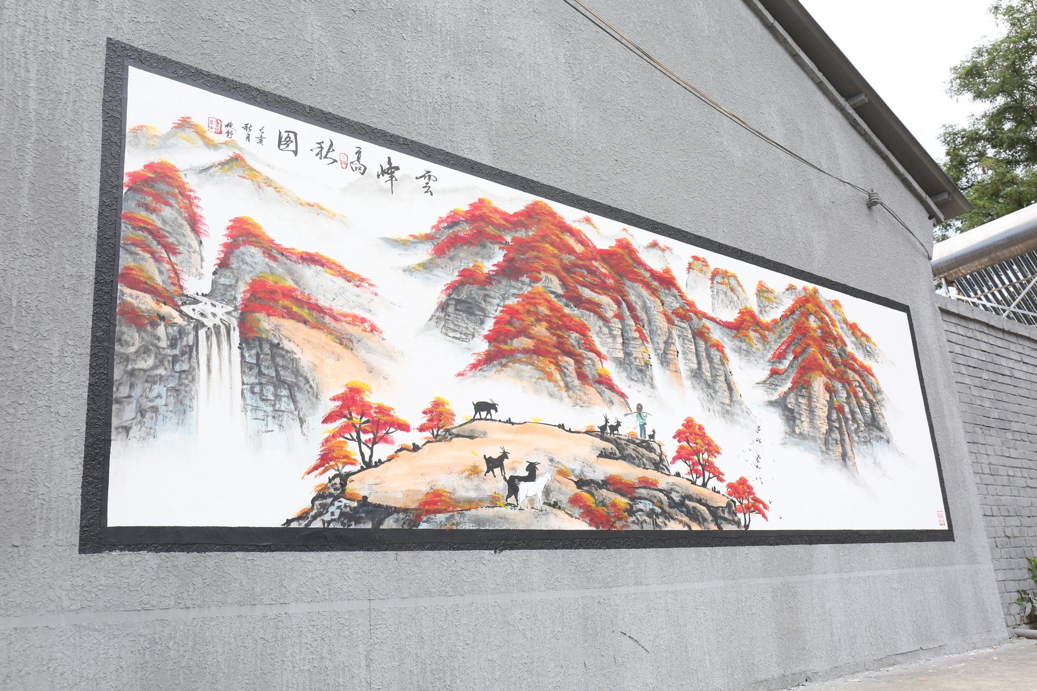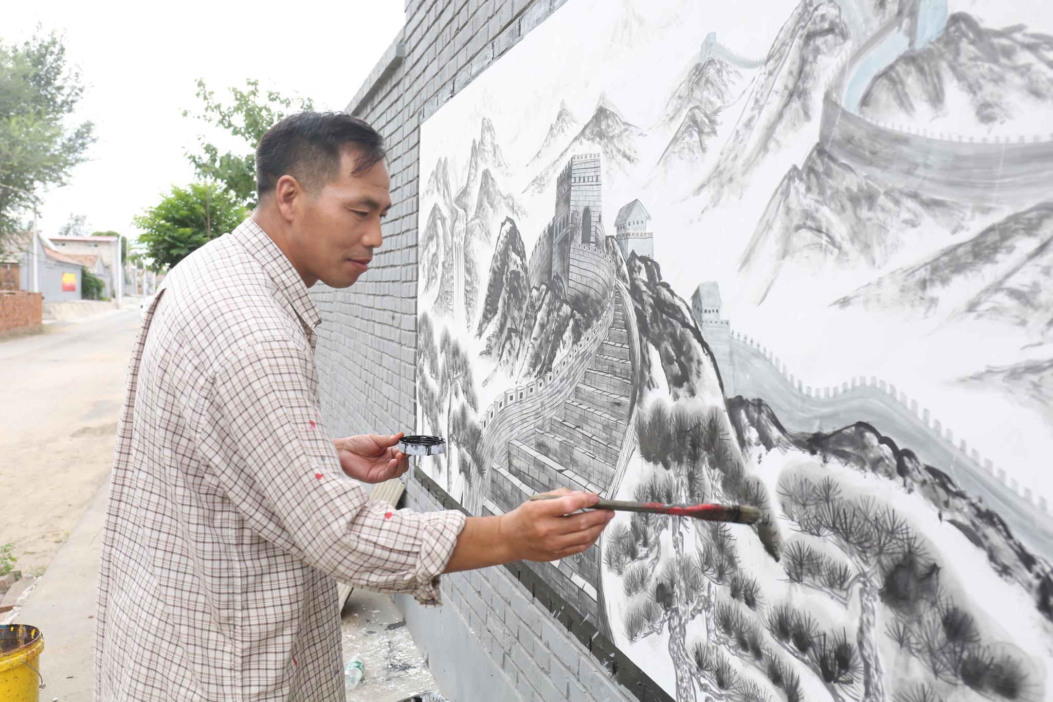 600米图文并茂的山水画、漫画、故事等彩绘把张各庄村装扮得五彩缤纷。受访者供图 左手端着颜料,右手拿着彩绘刷,张友良熟练地在墙壁上进行着创作。 今年8月,张各庄村开展了美丽乡村建设,当村庄环境治理取得一定成果后,村里又“突发奇想”,打算对村内南北主街的墙体进行美化升级,村里擅长绘画的张友良自告奋勇,经过和村“两委”讨论后,决定对这600多米的墙体进行彩绘。