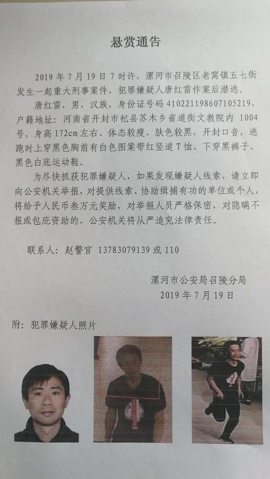 上门维修电话:028-83085150,大丰上菱消毒柜售后维修客服电话, 原标题:河南漯河发生一起重大刑案 警方悬赏3万元征集线索 据河南漯河市公安局7月19日下午通报,2019年7月19日7时许,漯河市召陵区老窝镇五七街发生一起重大刑事案件,犯罪嫌疑人唐红雷作案后潜逃。  唐红雷,男,汉族,身份证号码410221198607105219,户籍地址:河南省开封市杞县苏木乡省道街文教院内1004号,身高172cm左右、体态较瘦、肤色较黑,开封口音,逃跑时上穿黑色胸前有白色图案带红竖道T恤、下穿黑裤子、黑色白底运动鞋。  为尽快抓获犯罪嫌疑人,如果发现嫌疑人线索,请立即向公安机关举报,对提供线索、协助缉捕有功的单位或个人,将给予人民币叁万元奖励,对举报人员严格保密,对隐瞒不报或包庇资助的,公安机关将从严追究法律责任。联系人:赵警官 13783079139或110。 文/北京青年报记者 戴幼卿 李涛 责任编辑:祝加贝
