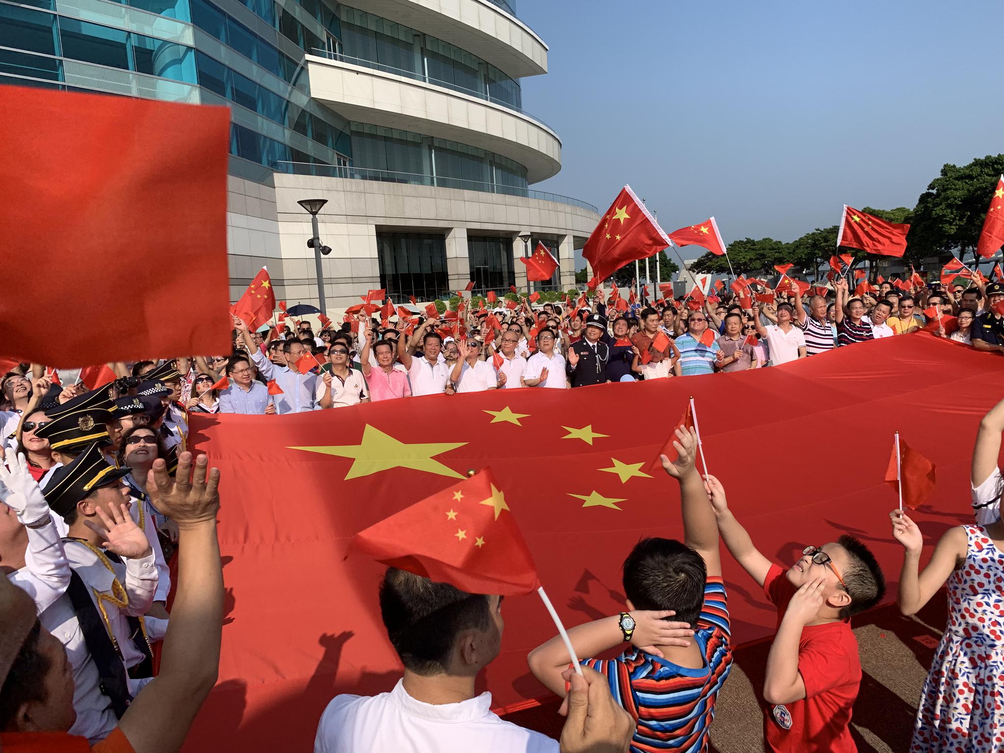 仪式结束后,部分民众围在一面巨幅五星红旗周围,齐声高喊“中国万岁!香港加油!” 新京报讯 今日(9月8日)上午8时,一面五星红旗和一面香港特别行政区区旗在香港金紫荆广场冉冉升起,此次升旗仪式由香港升旗队总会、香港岛各界联合会举办,有近千名市民到场参加。一名升旗队成员表示,看到红旗升起,“内心就会感到自豪”。仪式结束后,部分民众围在一面巨幅五星红旗周围,齐声高喊“中国万岁!香港加油!”  9月8日上午,香港金紫荆广场举行升旗仪式。 香港升旗队总会总监许振隆介绍,此次升旗仪式是一项常规活动。每天早上,金紫荆广场都会举行升旗仪式,平日由香港警方负责主持,逢每月第一或第二个星期日,仪式由香港升旗队总会负责。 上午8时,《义勇军进行曲》响彻香港金紫荆广场,一面中华人民共和国国旗和一面香港特别行政区区旗,在近千名市民的注目下缓缓升起。人群中,一名女市民手持小红旗,注目肃立,国歌唱到一半,她低头落泪。 仪式后,这位女士告诉新京报记者,自己是香港市民,昨天从网上看到升旗仪式的消息,便约上几个朋友前来,“我很担心香港的现状嘛,希望它的秩序尽快恢复,国歌响起后,觉得我们国家这些年风风雨雨,真的很不容易。” 另一位市民表示,他和妻子自发到场支持,是为了表达爱国之心,“国家富强、香港繁荣稳定,是我们的心愿。”  9月8日上午,近千名香港市民到金紫荆广场参加升旗仪式。 此次活动的主办方之一是香港升旗队总会,成立于2002年。许振隆向新京报记者介绍,作为香港特区政府认可的十三个制服团队之一,香港升旗队总会的宗旨是“推广国旗文化,推动国民教育,培养青年领袖”。 许振隆介绍,香港升旗队总会与香港各中、小学之间展开合作,以在总会培训、派遣志愿者去学校定期培训和培训老师这三种方式展开工作。目前,全港已有400所中小学成立了升旗队。 中三生(注:相当于内地“初三”)李颖欣七年前加入升旗队,目前担任总会青年队的副队长。今天是李颖欣第三次到金紫荆广场参加升旗仪式,她向新京报记者表示,“看到我们的国旗升起,内心就会感到自豪。” 一位姓黄的大一新生担任右护旗手,他告诉新京报记者,为了今天早上的升旗仪式,他和队友们在几周前就开始练习,“今天早上我们7点就到了,用练习旗排练了两次。” 许振隆表示,此次升旗仪式“有很多市民、学生参与,证明社会大众是关心国家的”,他希望通过这种形式,“能把一些正能量、正面的信息传递给大家,起到一个振奋民心的作用。” 仪式结束后,部分民众围在一面30多平方米的巨幅五星红旗周围,齐声高喊“中国万岁!香港加油!”  升旗仪式结束后,市民围着一面巨幅国旗合影。 新京报特派香港报道组 校对 李世辉