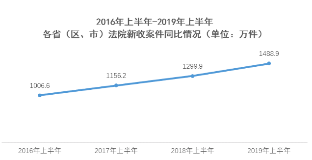 今年上半年,全国法官人均新收案件118.4件。 新京报快讯(记者 王俊)今天,最高法发布2019年上半年审判执行工作数据,全国法院新收案件近1500万件,广东、河南、江苏3省法院新收案数均超100万件;北京法院法官人均新收案件超过210件,重庆法院则超过180件。 306家法院新收案过万件 最高法审判管理办公室主任李亮介绍,2019年上半年,各省(区、市)法院新收案件1488.9万件,同比上升14.54%。 其中,广东、河南、江苏3省法院新收案数均超100万件,山东、浙江、四川、河北、安徽、辽宁、北京7省(市)法院新收案数超过50万件,306家法院新收案过万件。  2016年上半年-2019年上半年各省(区、市)法院新收案件同比情况。 全国法官人均新收案件118.4件 2019年上半年,各省(区、市)法院共有12.6万名员额法官,新收案件总数1488.9万件,人均新收案件118.4件。 具体来看,北京法院法官人均收案超过210件,重庆法院超过180件,广东法院超过170件,浙江法院超过160件,上海、江苏2省(市)法院超过150件。 各省(区、市)法院审执结案件1189.5万件,同比上升17.14%,人均结案94.6件。北京、浙江、重庆3省(市)法院人均结案数超过150件,上海、江苏、广东、河南、山东、天津6省(市)法院超过100件。 李亮表示,为有效应对全国法院新收案件数长期持续大幅增长带来的挑战,各级法院深入推动司法体制综合配套改革,全面落实司法责任制要求,严格落实法官办案主体责任和院庭长审判监督管理责任,一线办案人员积极性不断增强。 新京报记者 王俊 编辑 白爽 校对 刘军