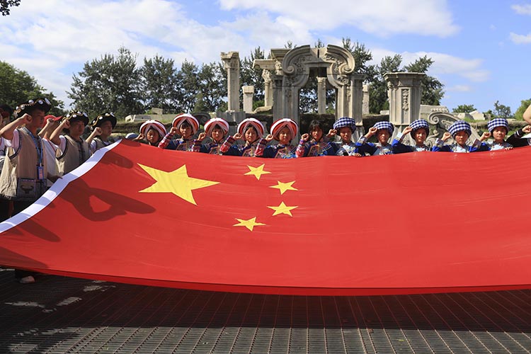 圆明园大水法遗址前,来自贫困地区的少数民族学生宣誓:立志守护五星红旗,做新时代的爱国者。