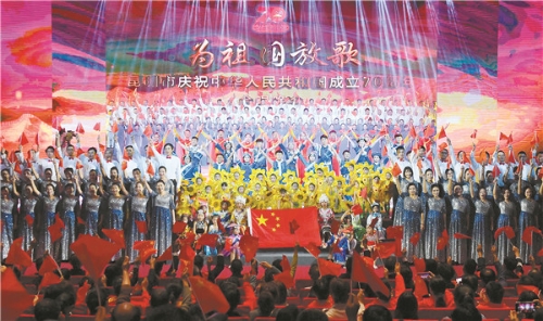 昨晚,由昆明市委、市政府主办的昆明市庆祝中华人民共和国成立70周年“为祖国放歌”合唱晚会在昆明会堂举行。 记者杨艳辉摄 为庆祝中华人民共和国成立70周年,昨晚,由昆明市委、市政府主办的昆明市庆祝中华人民共和国成立70周年“为祖国放歌”合唱晚会在昆明会堂举行。 省委常委、市委书记、滇中新区党工委书记程连元,市委副书记刘智,市人大常委会主任拉玛·兴高,市政协主席熊瑞丽出席晚会并为合唱比赛获奖单位颁奖。 合唱晚会在回顾昆明市庆祝中华人民共和国成立70周年群众合唱比赛花絮的视频中拉开序幕。“今天是你的生日,我的中国……”“我爱你中国……”晚会上,由昆明市庆祝中华人民共和国成立70周年群众合唱比赛遴选出的优秀合唱团及交响乐团和舞者,用美妙的歌声和曼妙的舞姿诉说着华夏儿女对祖国深深的爱恋和赤子之心。整场晚会由《唱响爱国情》《奋进新时代》《共筑中国梦》和《尾声》四个篇章组成。合唱、表演唱、领唱、朗诵、交响乐等艺术表现形式轮番上阵,为观众献上一台精彩的视听盛宴。整台晚会热情讴歌了党和国家的伟大事业,传达了人民群众对祖国的真挚祝福,表达了各族人民积极投入新时代建设,实现“两个一百年”奋斗目标、共筑中国梦的信心和决心,并进一步增强爱国热情和民族自豪感,激励全市人民为实现中华民族伟大复兴的中国梦贡献力量。 李建阳、金幼和、刘申寿、夏俊松、戚永宏、周建忠、周红斌、刘绍安、胡炜彤、李冰晶、郭希林一同观看了演出。(昆明日报 记者杜仲莹)