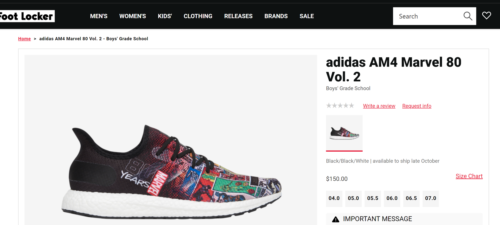 新京报讯(记者 覃澈)10月4日,2019年纽约漫展上,阿迪达斯一款与漫威和Foot Locker联名的AM4正式亮相,以祝贺漫威成立80周年。记者了解到,该款鞋在多个球鞋交易群中已成为“热品”,甚至有玩家出近万元求购该鞋。 “究竟是买回去收藏,还是用以投机盈利,谁也说不清楚。”一位资深玩家向记者说。 记者从业内人士处获悉,该联名鞋于10月4日在美国正式开售,10月18日则在Foot Locker官网发售,售价为150美元。
