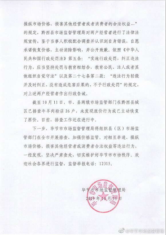原标题:贵州黔西县牛羊肉粉店串通涨价,市场监督管理局介入调查