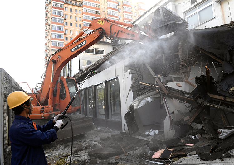 工人洒水降尘。 新京报讯 10月28日,朝阳区麦子店城管队依法拆除枣营社区一处存在多年的违法建设。该处房屋扩建部分未取得相关规划许可手续,长期占用公共区域。 记者在拆除现场看到,违建部分面积约300平方米,其钢结构已严重腐蚀。当事人配合城管队员对违建部分进行了拆除,并清理了店内物品。