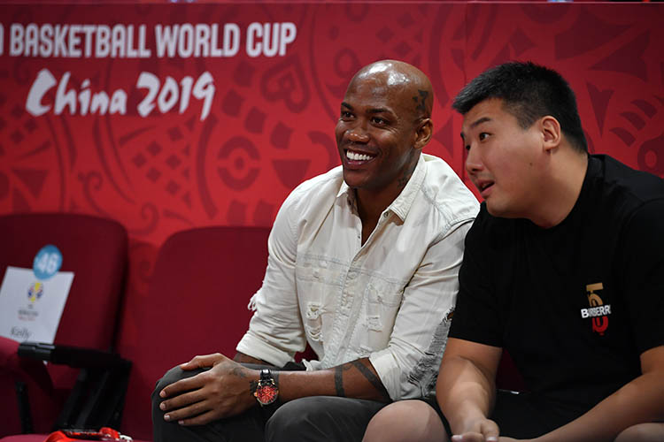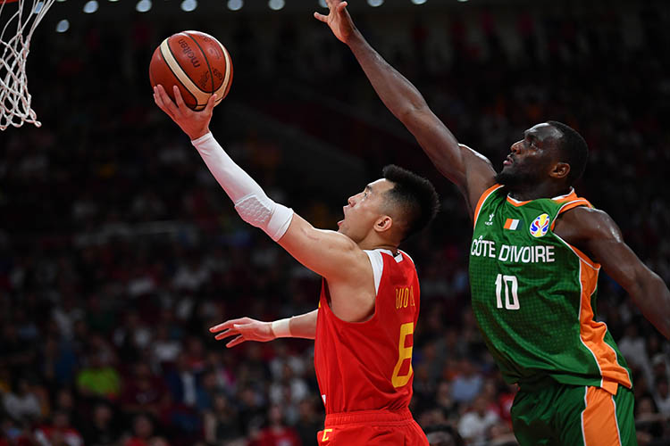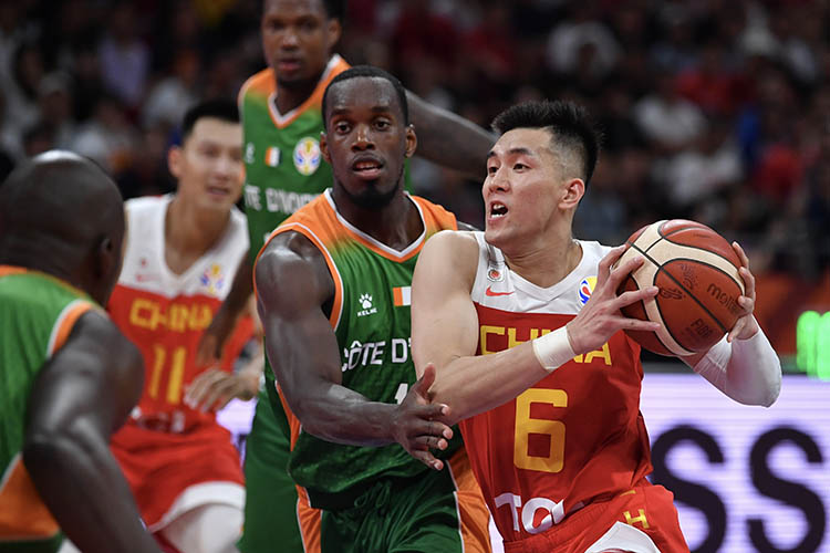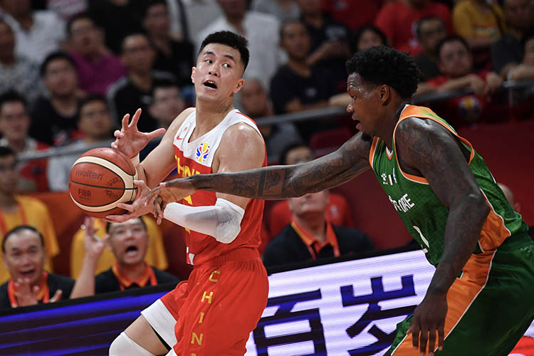 中国队6号郭艾伦带球遭遇对手紧逼。