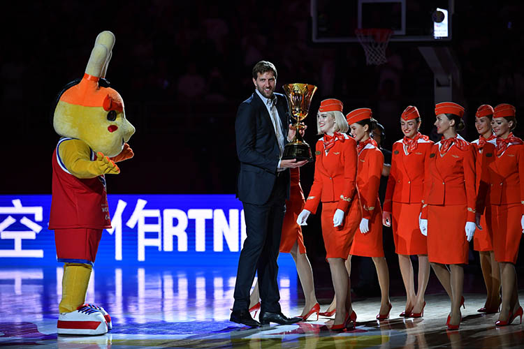 NBA明星诺维茨基手捧冠军奖杯亮相五棵松体育中心。