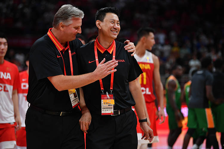 取胜后,中国男篮主教练李楠终于放松地笑了。