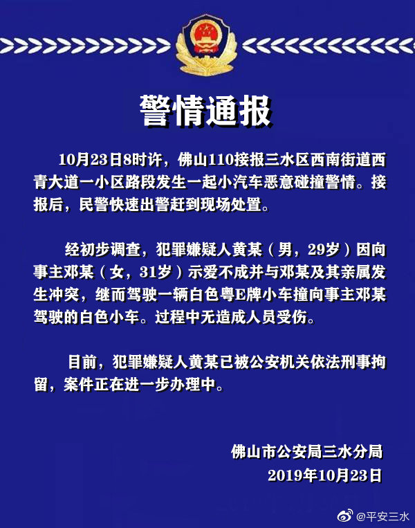 新京报快讯 据广东省佛山市公安局三水分局官方微博消息,一男子因示爱不成与一女子及其亲属发生冲突,继而驾车撞向女子驾驶的小车。