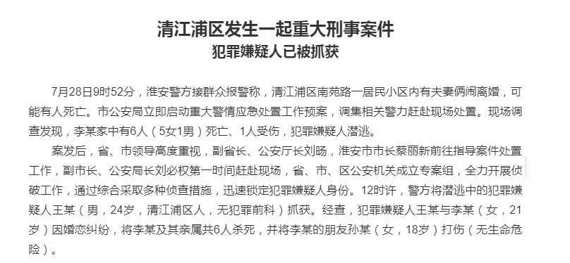 上门维修电话:028-83085150,双流睿侠抽油烟机售后维修网点电话,原标题:江苏一男子因婚恋纠纷杀害妻子及其亲属6人 已被抓获 新京报快讯 据江苏淮安市公安局清江浦分局官方微博消息,7月28日9时52分,淮安警方接群众报警称,清江浦区南苑路一居民小区内有夫妻俩闹离婚,可能有人死亡。市公安局立即启动重大警情应急处置工作预案,调集相关警力赶赴现场处置。现场调查发现,李某家中有6人(5女1男)死亡、1人受伤,犯罪嫌疑人潜逃。 案发后,省、市领导高度重视,副省长、公安厅长刘旸,淮安市市长蔡丽新前往指导案件处置工作,副市长、公安局长刘必权第一时间赶赴现场,省、市、区公安机关成立专案组,全力开展侦破工作,通过综合采取多种侦查措施,迅速锁定犯罪嫌疑人身份。12时许,警方将潜逃中的犯罪嫌疑人王某(男,24岁,清江浦区人,无犯罪前科)抓获。经查,犯罪嫌疑人王某与李某(女,21岁)因婚恋纠纷,将李某及其亲属共6人杀死,并将李某的朋友孙某(女,18岁)打伤(无生命危险)。 来源:江苏淮安市公安局清江浦分局官方微博