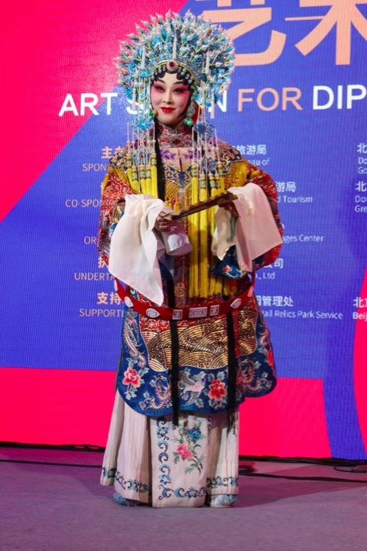 张馨月献上京剧经典剧目《贵妃醉酒》选段。摄影/新京报记者 陈沁涵 嘉宾讲话结束后,文艺表演拉开帷幕。北京民族乐团玖木打击乐组合带来表演《鼓舞中华》,鼓声磅礴、声声震天。北京京剧院演员张馨月作为已故梅派掌门梅葆玖的弟子,为来宾献上了京剧经典剧目《贵妃醉酒》选段。中国杂技团曹凯为观众展示了球技《激踏》,他脚踩踢踏舞节拍,两手控球收放自如,将绚烂的球技和舞步完美结合。最后,HAYA乐团压轴出场,乐团主唱黛青塔娜说:“之所以创作世界音乐,是因为很多不一样的人群生活在这个地球上,音乐应该互相融合,表现得丰富多彩。” 在艺术沙龙活动中,各国嘉宾还体验了以剪纸、中国结、拓印、北京绒花为代表的文化非遗项目。“金石传拓”展台前聚集了许多外国友人。中央工艺美术学院附中校长王泽旭是东城区传拓非遗技艺传承人,他将拓纸牢牢沾在石碑上,用鬃刷敲打,然后用颜料调出色彩进行拓印。王泽旭说,这门技艺是中国独有的,可以追溯到北魏时期。在印刷术还没有发明出来时,金石器物上文化印记主要靠传拓印来传承,渊源流传至今。